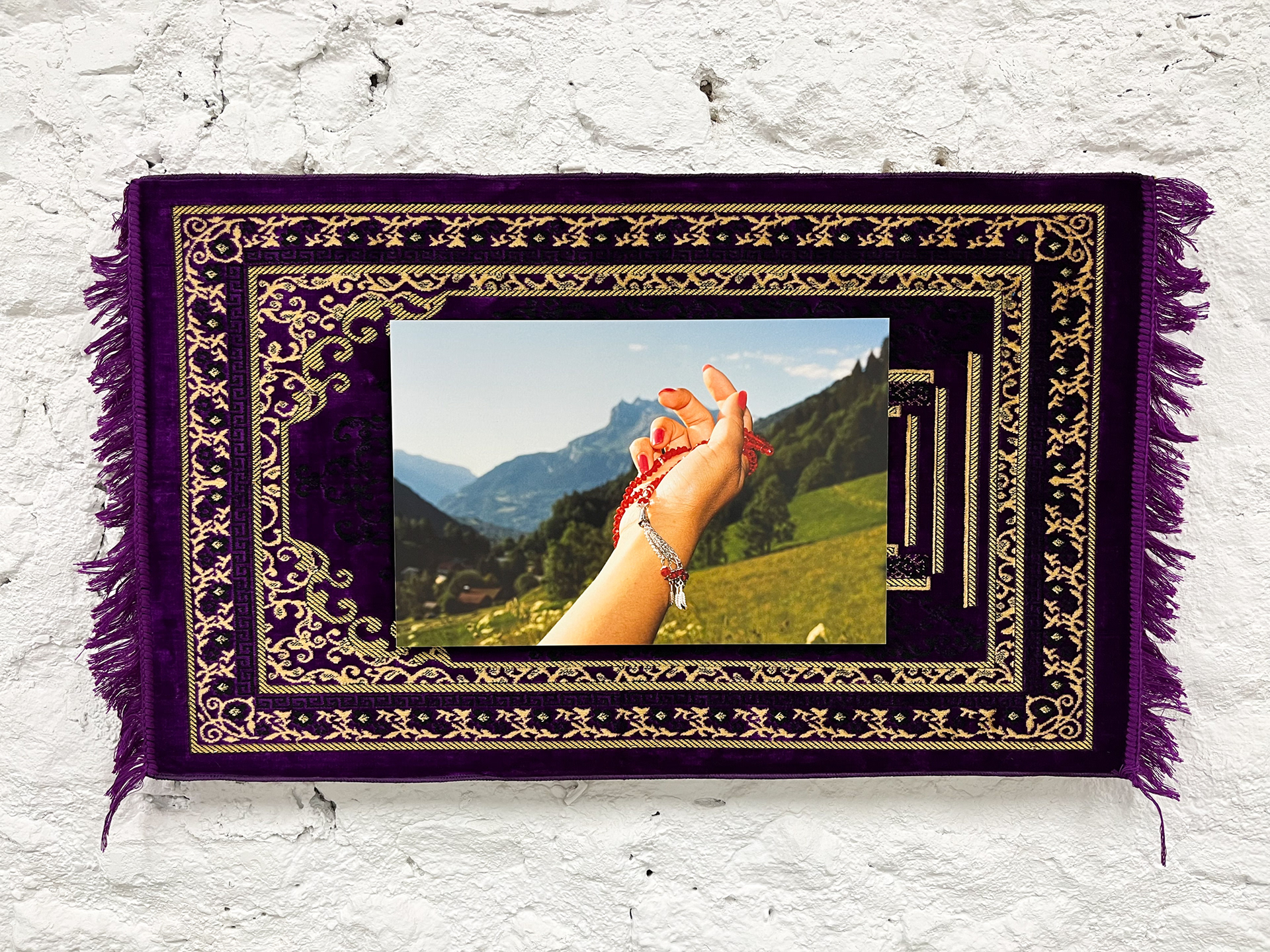 Aïcha Ingalls, photographie argentique 30x45cm contrecollée et installée sur tapis de prière 65x105cm, Saint Gervais, 2022